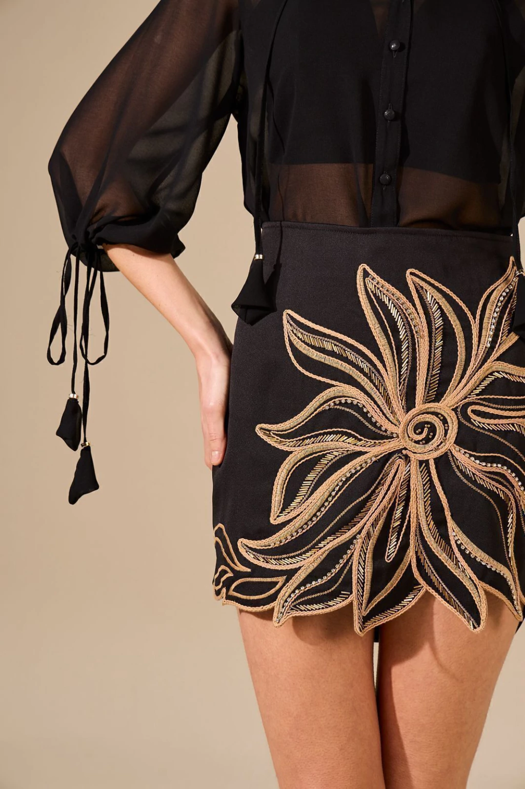 Conjunto composto por camisa em crepe com acabamento manual detalhes na manga que enriquece a peça. O fechamento frontal conta com botões encapados que adicionam charme ao visual. A saia curta, em alfaiataria, segue a mesma proposta refinada, unindo bordados industrial e manual em pedrarias, com fechamento posterior por zíper que garante caimento impecável.